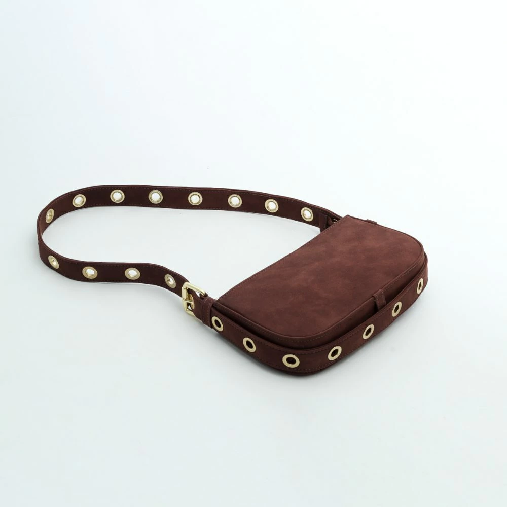 Bolsa pequena produzida no material Nobuck, e alça com ilhós reguláveis em dourado, bolso interno.