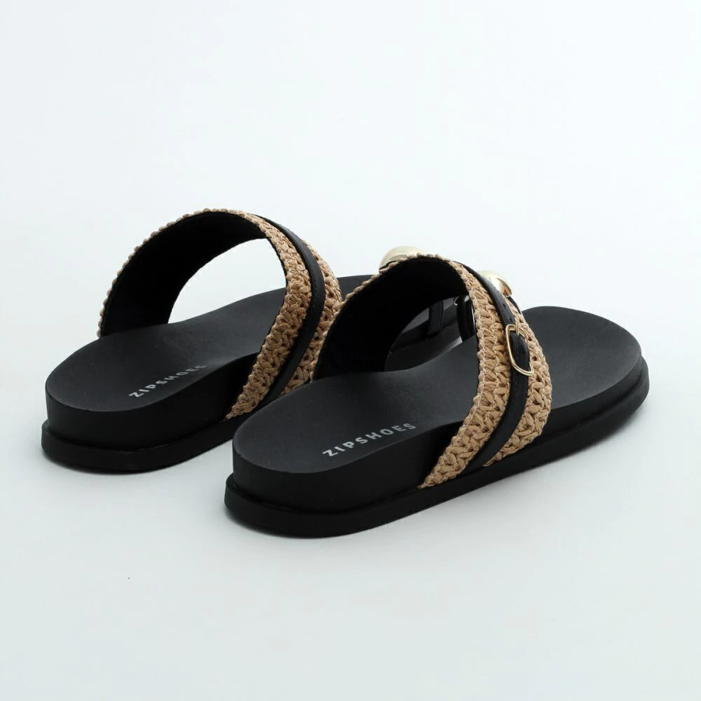 Rasteira de dedo com palmilha anatômica, possui tira larga revestida de palha no cabedal e detalhe dourado no dedo.