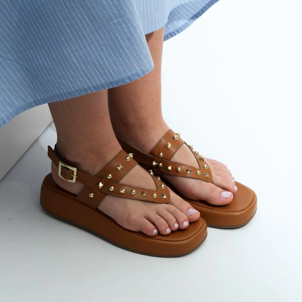 Sandália de dedo com enfeites dourados e ajuste no tornozelo.