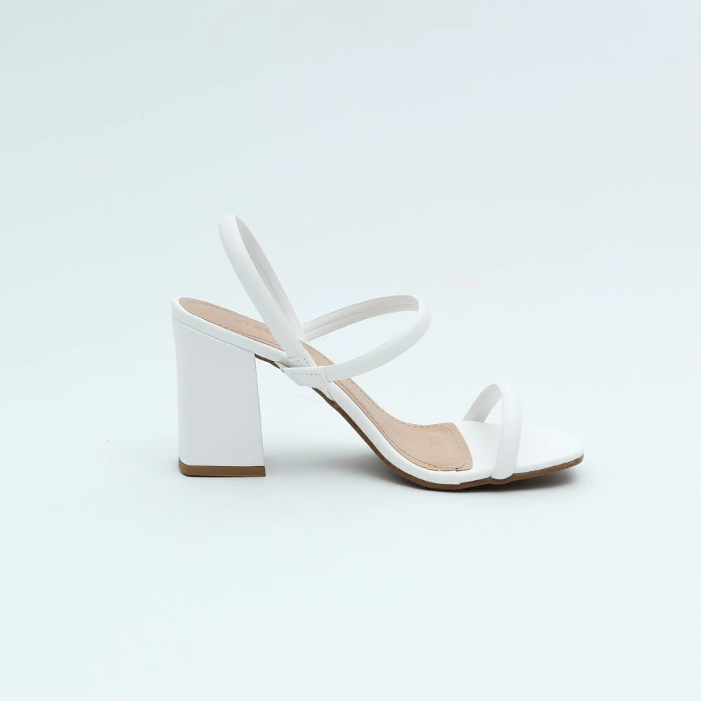 Sandália minimalista com três tiras e salto bloco de 8 cm.