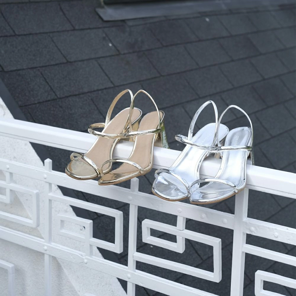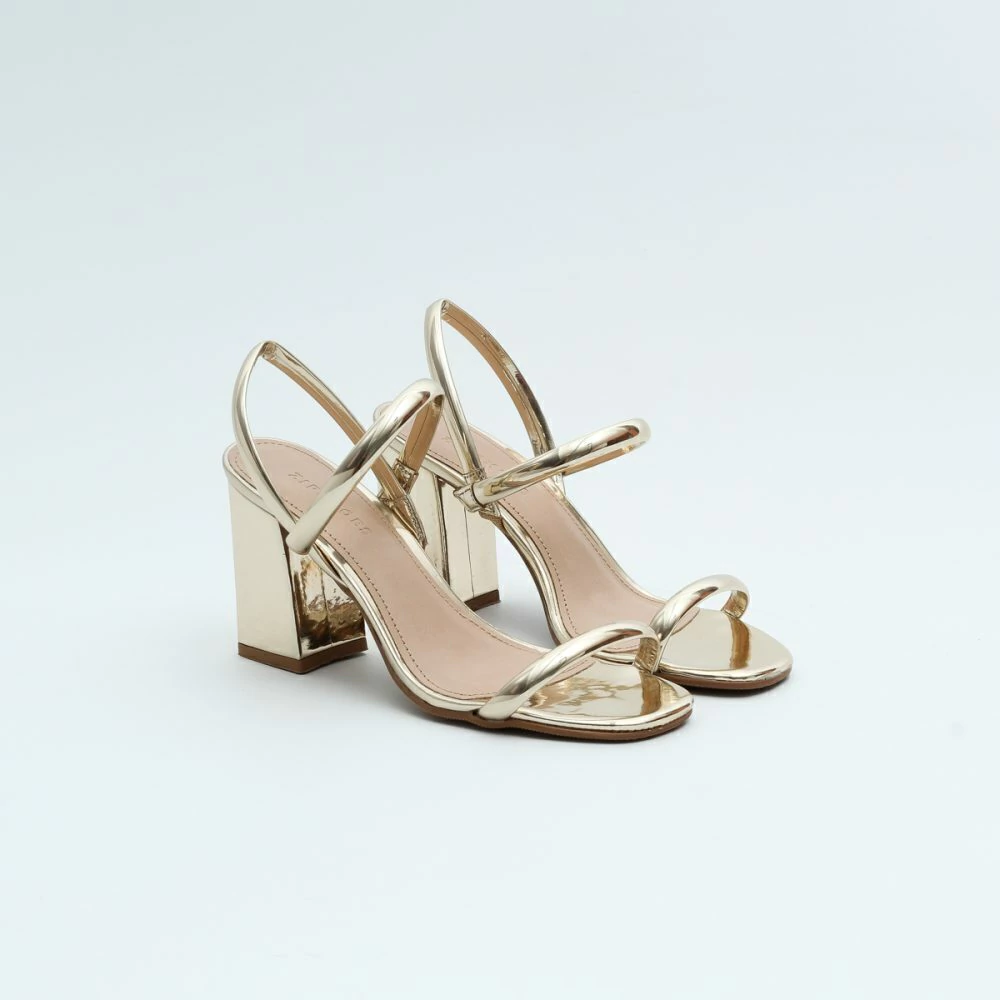 Sandália minimalista com três tiras e salto bloco de 8 cm.