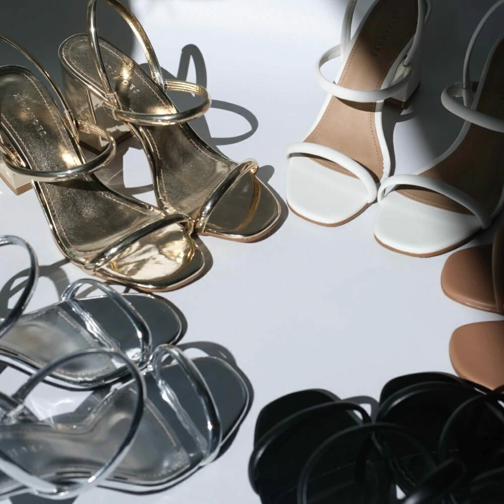 Sandália minimalista com três tiras e salto bloco de 8 cm.